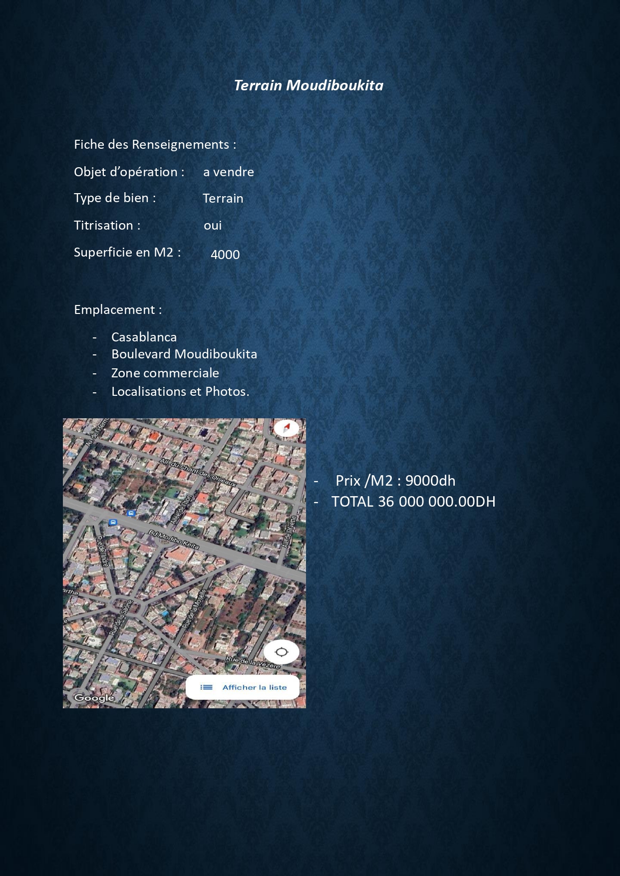 Annonce & PublicitéImmobilier a vendre…Terrain Moudiboukita à CASABLANCA By admin On Mai 27, 2023 0 Share Contacte: aknouch1999@yahoo.fr GSM: +212 661 866 691. 0 Share FacebookTwitterGoogle+WhatsAppLinkedinCourriel