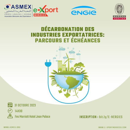 ASMEX organise en partenariat avec Engie et BureauVeritas une conférence sur le thème « Décarbonation des Industries exportatrice: parcours et échéances », le mardi 31 Octobre 2023 à Fès