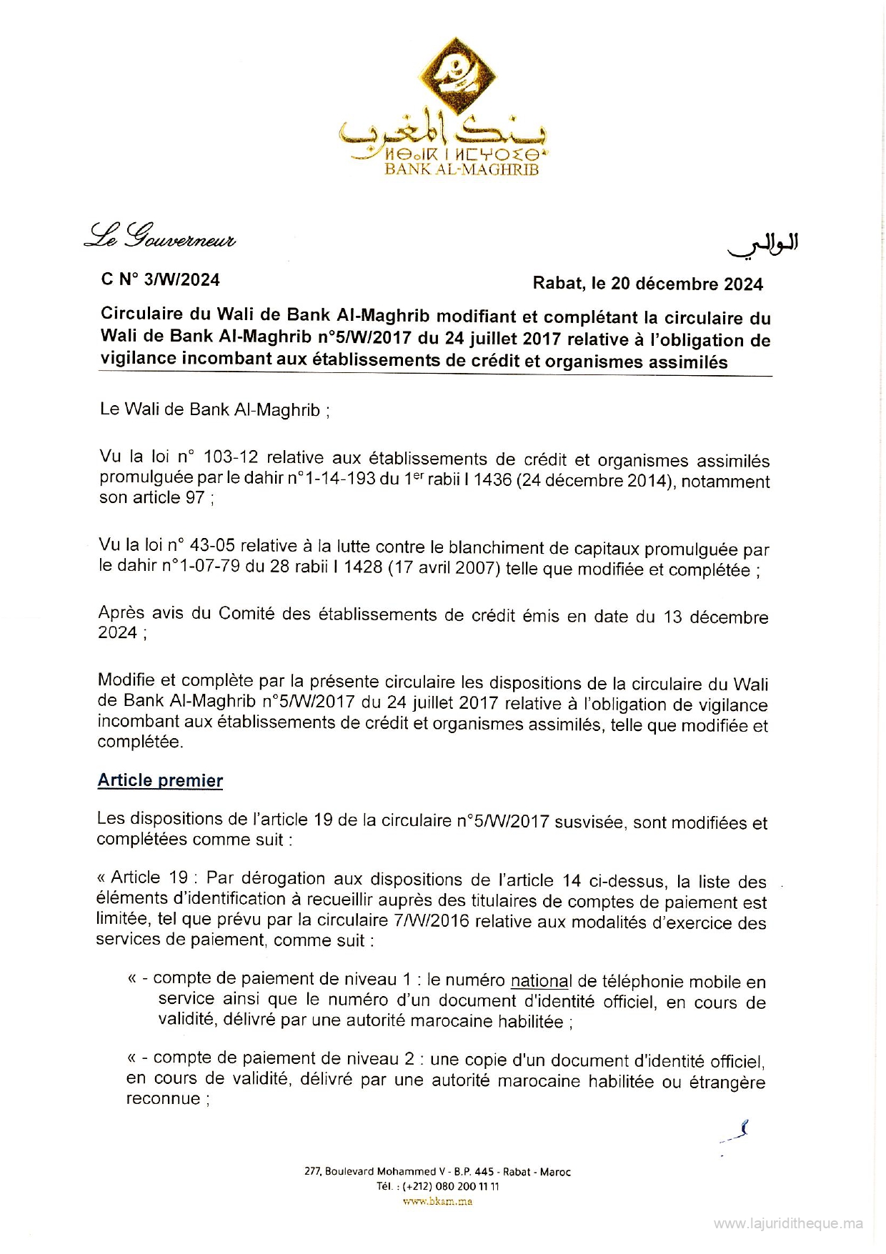 La Circulaire du Wali de Bank Al-Maghrib n°3/W/2024 du 20 décembre 2024 vient de modifier et compléter les dispositions de la circulaire du Wali de Bank Al-Maghrib n°5/W/2017 du 24 juillet 2017 relative à l’obligation de vigilance incombant aux établissements de crédit et organismes assimilés, telle que modifiée et complétée.