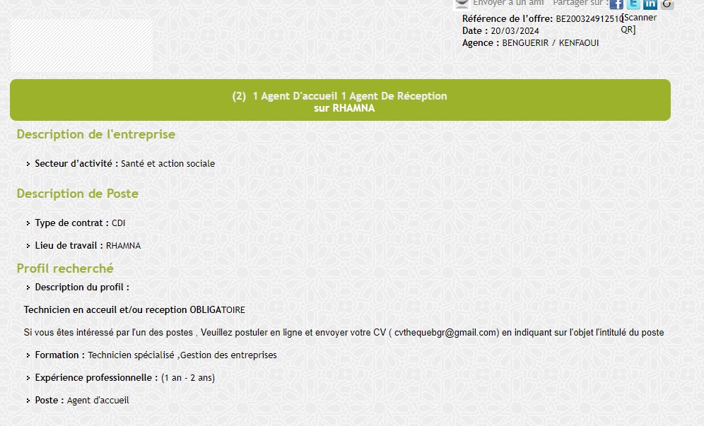 L’intitulé du poste proposé : 1 Agent D’accueil 1 Agent de réception