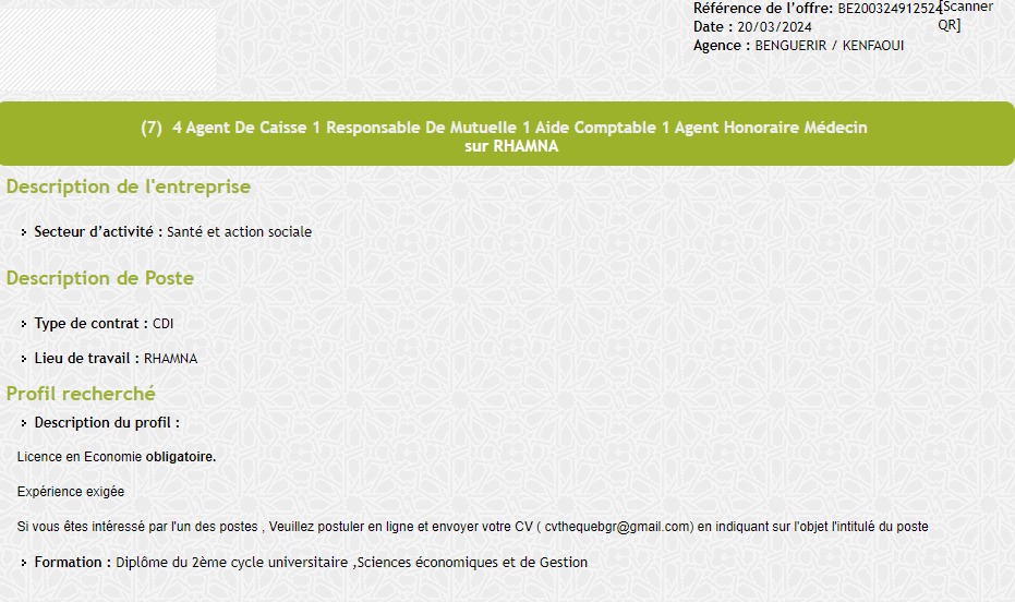 L’intitulé du poste proposé : 4 Agent de caisse 1 Responsable de mutuelle 1 Aide Comptable 1 Agent Honoraire Médecin