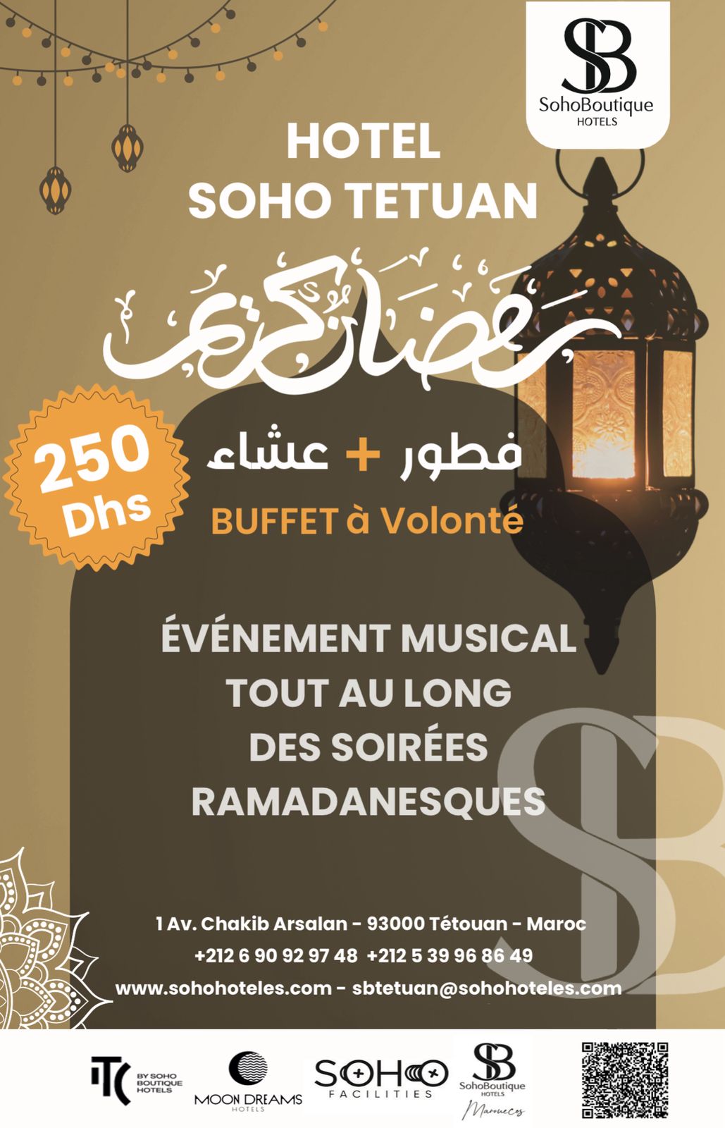 A l’occasion du mois béni du Ramadan, l’Administration Générale de l’unité hôtelière HOTEL SOHO de Tétouan, en coordination avec l’une des associations musicales, organise chaque soir des soirées artistiques qui incluent des segments andalous, ainsi que l’organisation de séminaires et de rencontres intellectuelles, auxquels participent des universitaires et des chercheurs en pensée, culture et patrimoine islamiques.